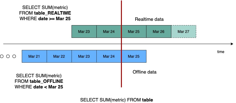 Suppose, we get a query to this table : select sum(metric) from table. The broker will split the query into 2 queries based on this time boundary – one for offline and one for real-time. This query becomes select sum(metric) from table_REALTIME where date >= Mar 25