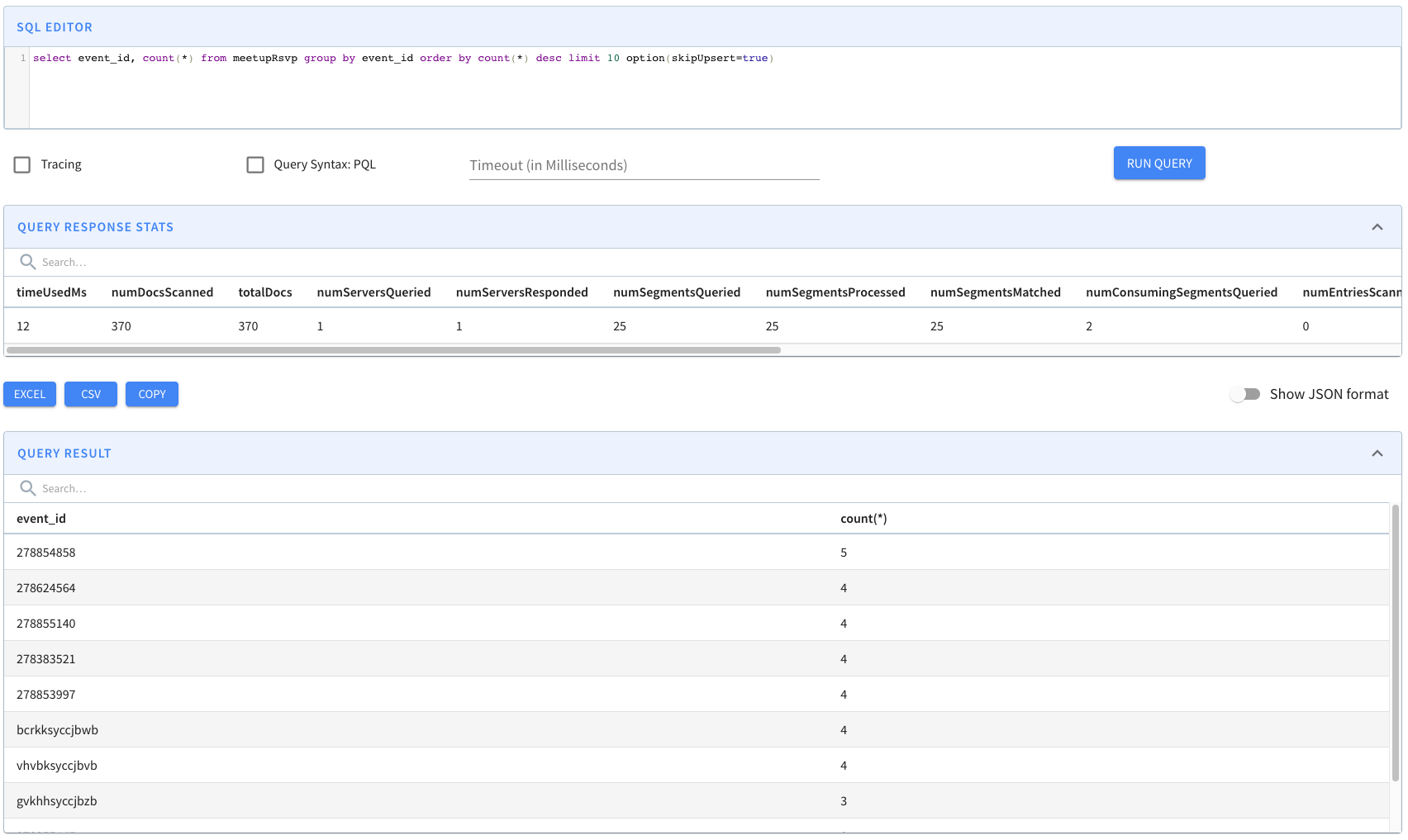 An example for partial upsert is shown below, each of the event_id kept being unique during ingestion, meanwhile the value of rsvp_count incremented.