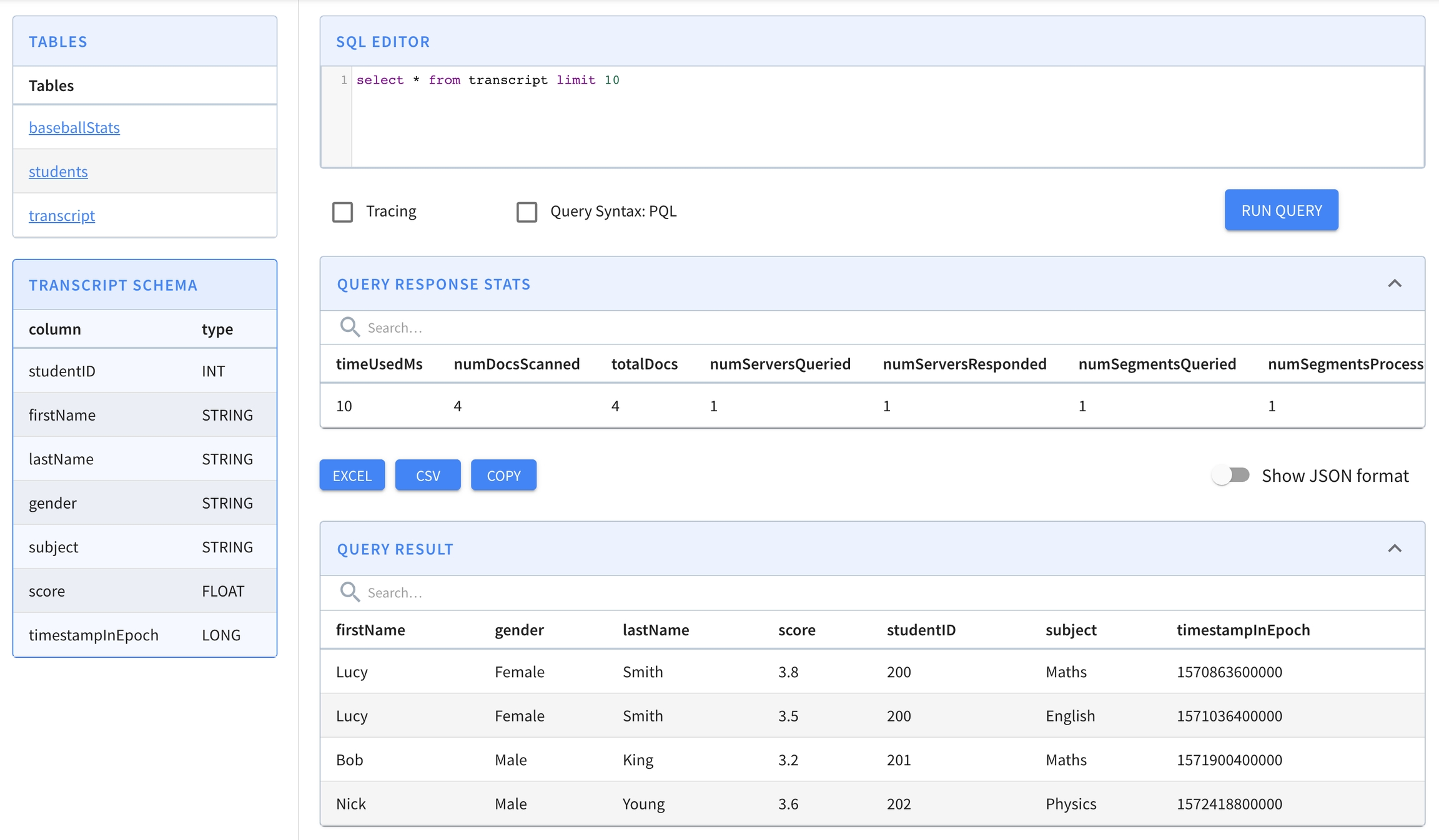 Response for pushing table transcript segment transcript_OFFLINE_1570863600000_1572418800000_0 to location http://localhost:9000 - 200: {"status":"Successfully uploaded segment: transcript_OFFLINE_1570863600000_1572418800000_0 of table: transcript"}Confirm that your segment made it into the table using the Rest API.
