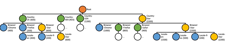 Dimensions split order ([D1, D2]): Nodes at a given level in the tree are split into children nodes on all values of a particular dimension. The dimensions split order is an ordered list of dimensions that is used to determine the dimension to split on for a given level in the tree.