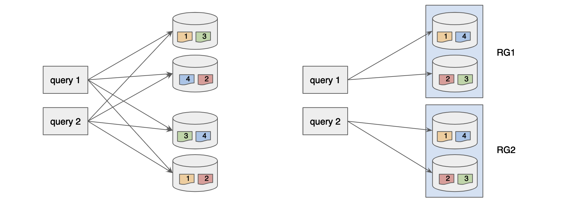 As seen above, replica groups give you the control on the number of servers to span for each query. When you try to decide the proper number of numReplicaGroups and numInstancesPerReplicaGroup, consider the trade-off between throughput and latency. Given a fixed number of servers, increasing numReplicaGroups factor while decreasing numInstancesPerReplicaGroup will make each query use less servers, which may reduce the possibility of one of them having a full GC. However, each server will need to process more number of segments per query, reducing the throughput, to the point that extreme values may even increase the average latency. Similarly, decreasing numReplicaGroups while increasing numInstancesPerReplicaGroup will make each query use more servers, increasing the possibility of one of them having a full GC but making each server process less number of segments per query. So, this number has to be decided based on the use case requirements.