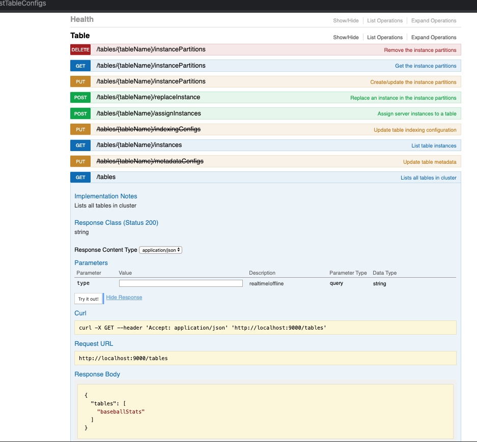 Let's check out the tables in this cluster by going to Table -> List all tables in cluster and click on Try it out!. We can see the baseballStats table listed here. We can also see the exact curl call made to the controller API.
