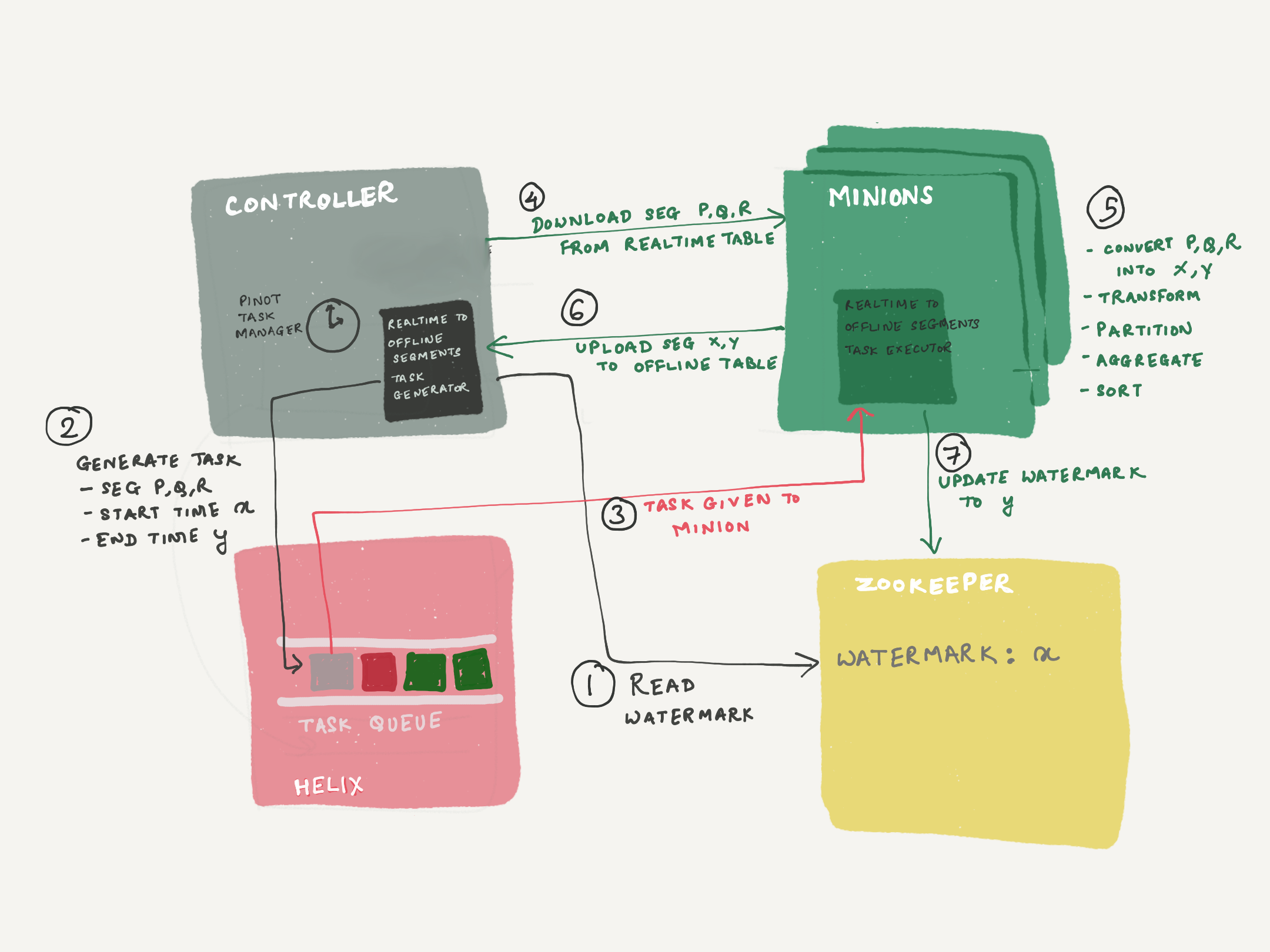 RealtimeToOfflineSegmentsTaskGenerator - This is the minion task scheduler, which schedules tasks of type "RealtimeToOfflineSegmentsTask". This task is scheduled by the controller periodic task - PinotTaskManager. A watermark is maintained in zookeeper, which is the end time of the time window last successfully processed. The task generator refers to this watermark, to determine the start of the time window, for the next task it generates. The end time is calculated based on the window length (configurable, 1d default). The task generator will find all segments which have data in [start, end), and set it into the task configs, along with the start and end. The generator will not schedule a new task, unless the previous task has COMPLETED (or been stuck for over 24h). This is to ensure that we always move records in sequential time windows (exactly mimicking offline flows), because out-of-order data pushes will mess with the time boundary calculation of the hybrid table.