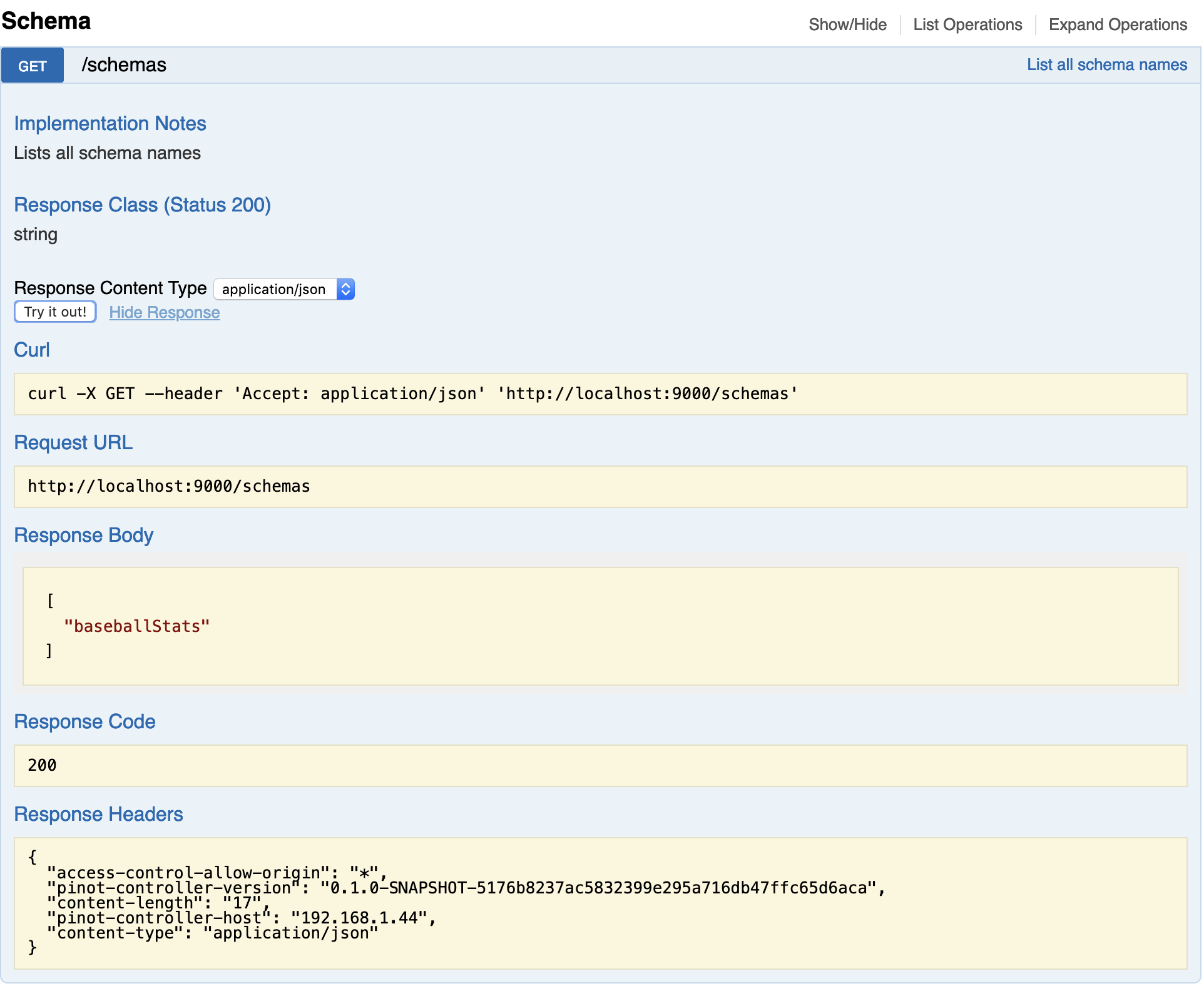 Listing all the schemas in the Pinot cluster: