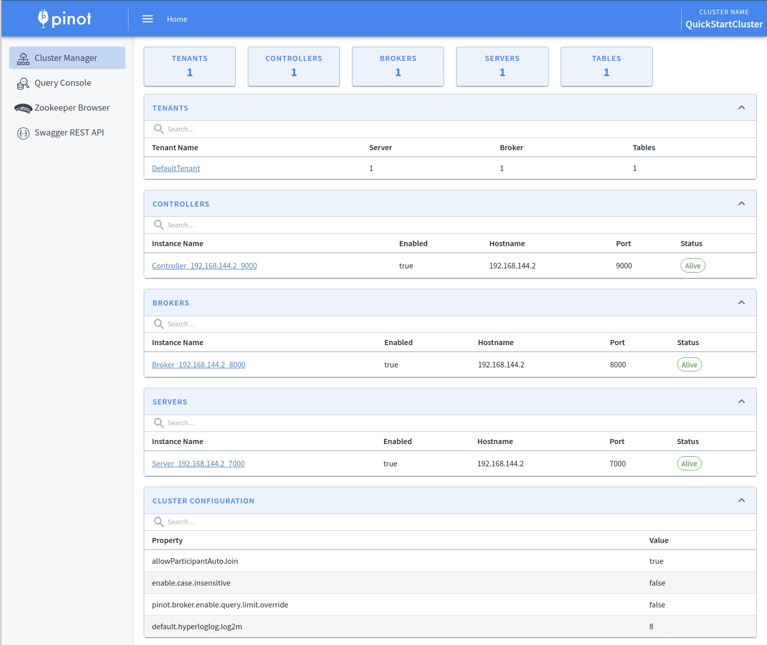 The first screen that you'll see when you open the Pinot Data Explorer is the Cluster Manager. The Cluster Manager provides a UI to operate and manage your cluster.
