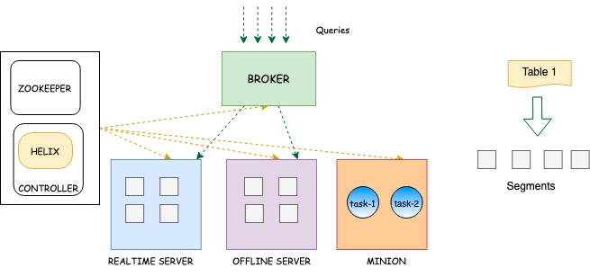 (Optional) Minion: Computes background tasks other than query processing, minimizing impact on query latency. Optimizes segments, and builds additional indexes to ensure performance (even if data is deleted).