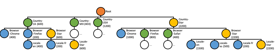 Note: In above example configs maxLeafRecords is set to 1 so that all of the dimension combinations are pre-aggregated for clarity in visual below.