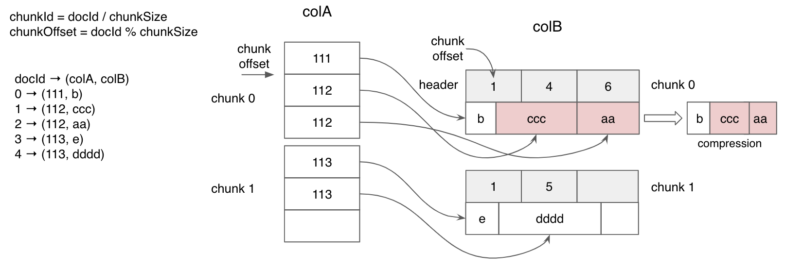 The diagram below illustrates dictionary encoding for two columns with different data types (integer and string). For colA, dictionary encoding leads to significant space savings due to duplicated values. However, for colB, which contains mostly unique values, the compression effect is limited, and padding overhead may be high.