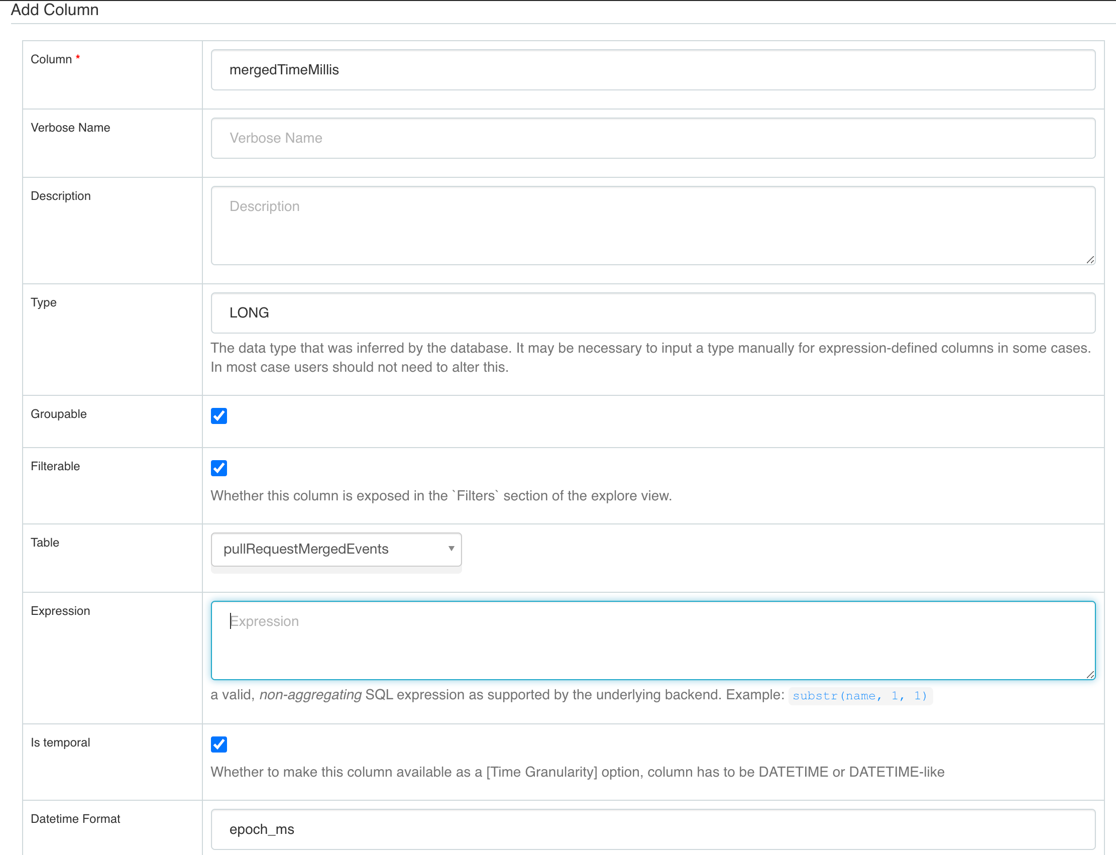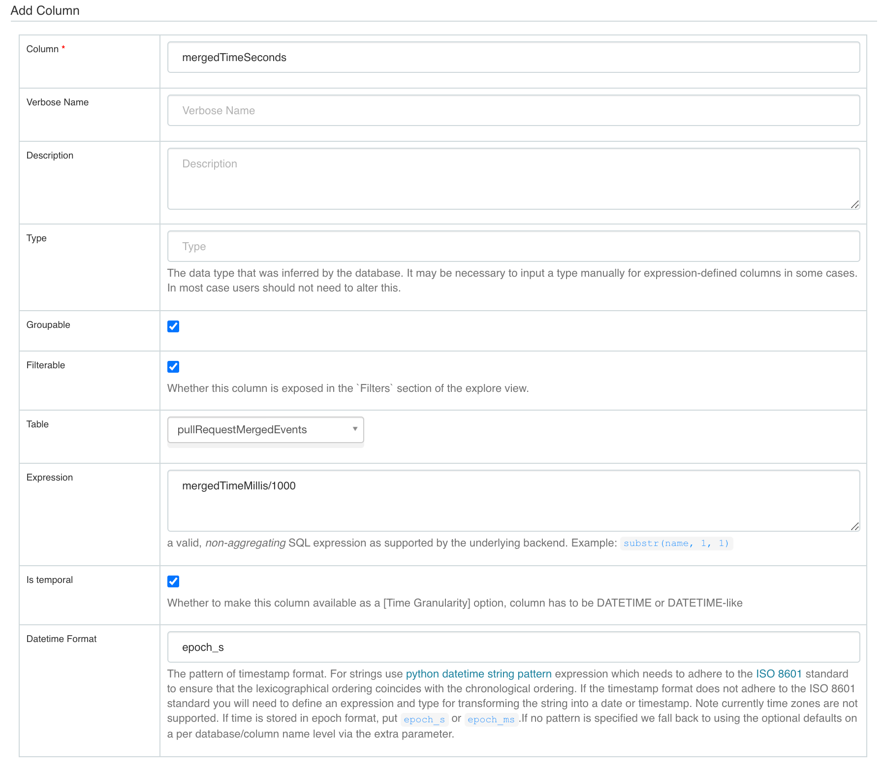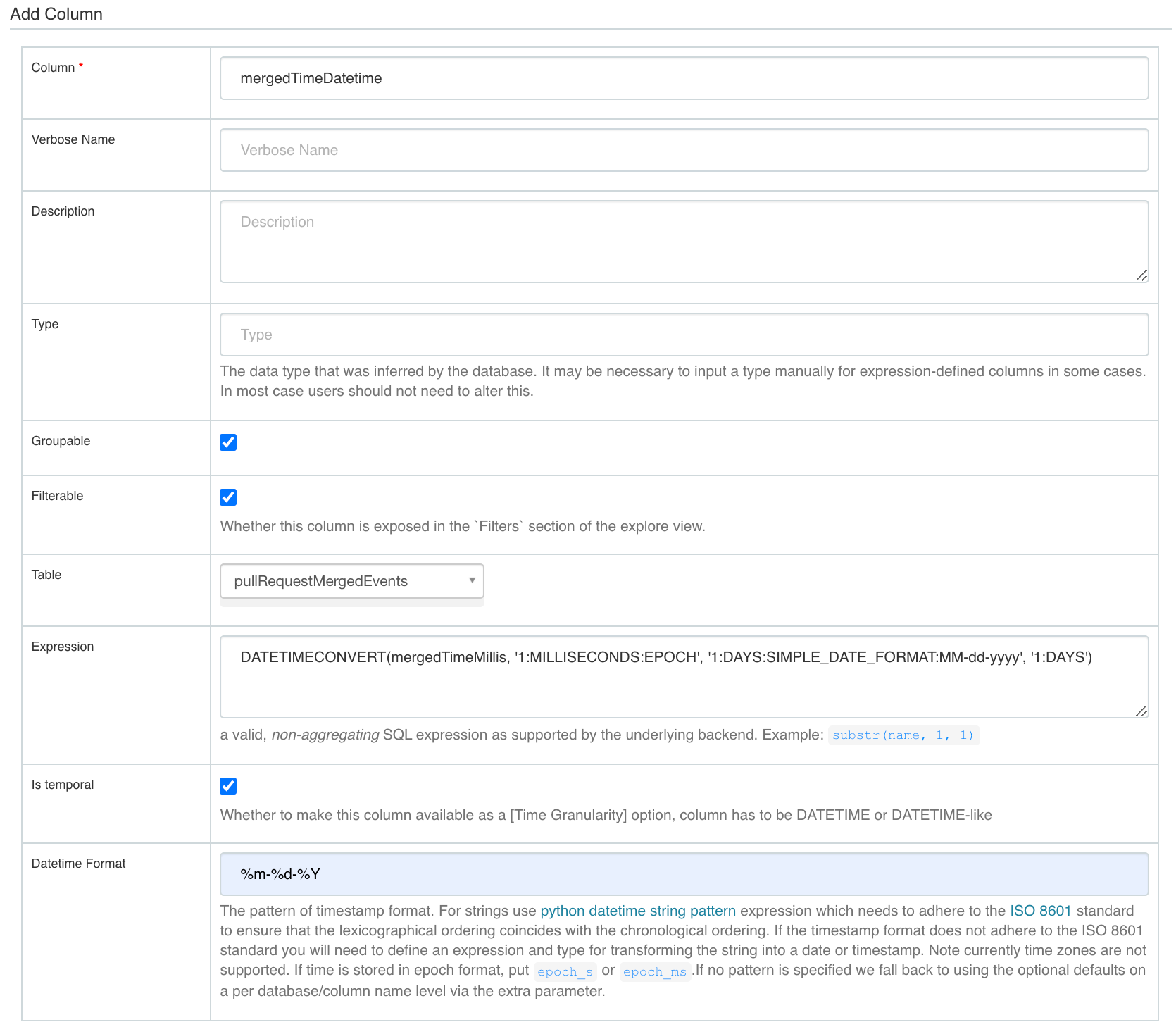 Configuring time column