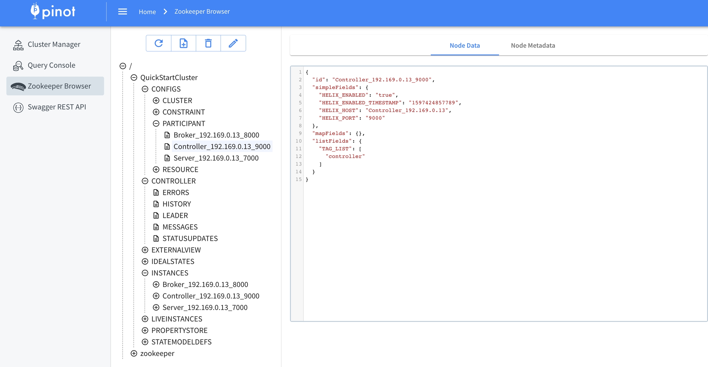 Zookeeper, as a first-class citizen of a Pinot cluster, may use the well-known ZNode structure for operations and troubleshooting purposes. Be advised that this structure can change in future Pinot releases.