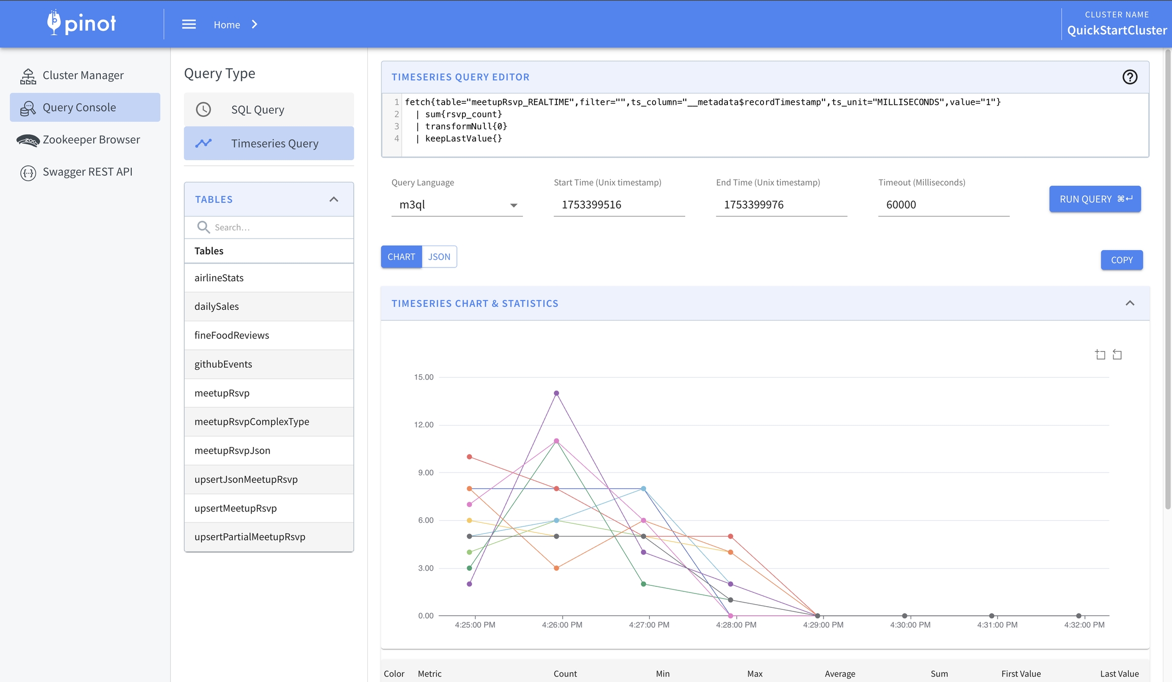 meetupRSVPEventsthat is subscribed to by Pinot.Issues sample queries to Pinot