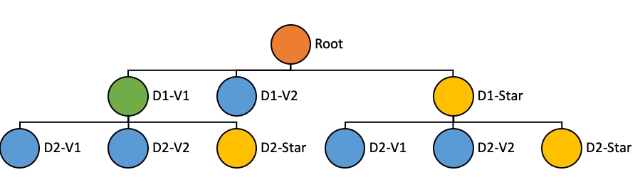 Dimensions split order ([D1, D2]): Nodes at a given level in the tree are split into children nodes on all values of a particular dimension. The dimensions split order is an ordered list of dimensions that is used to determine the dimension to split on for a given level in the tree.