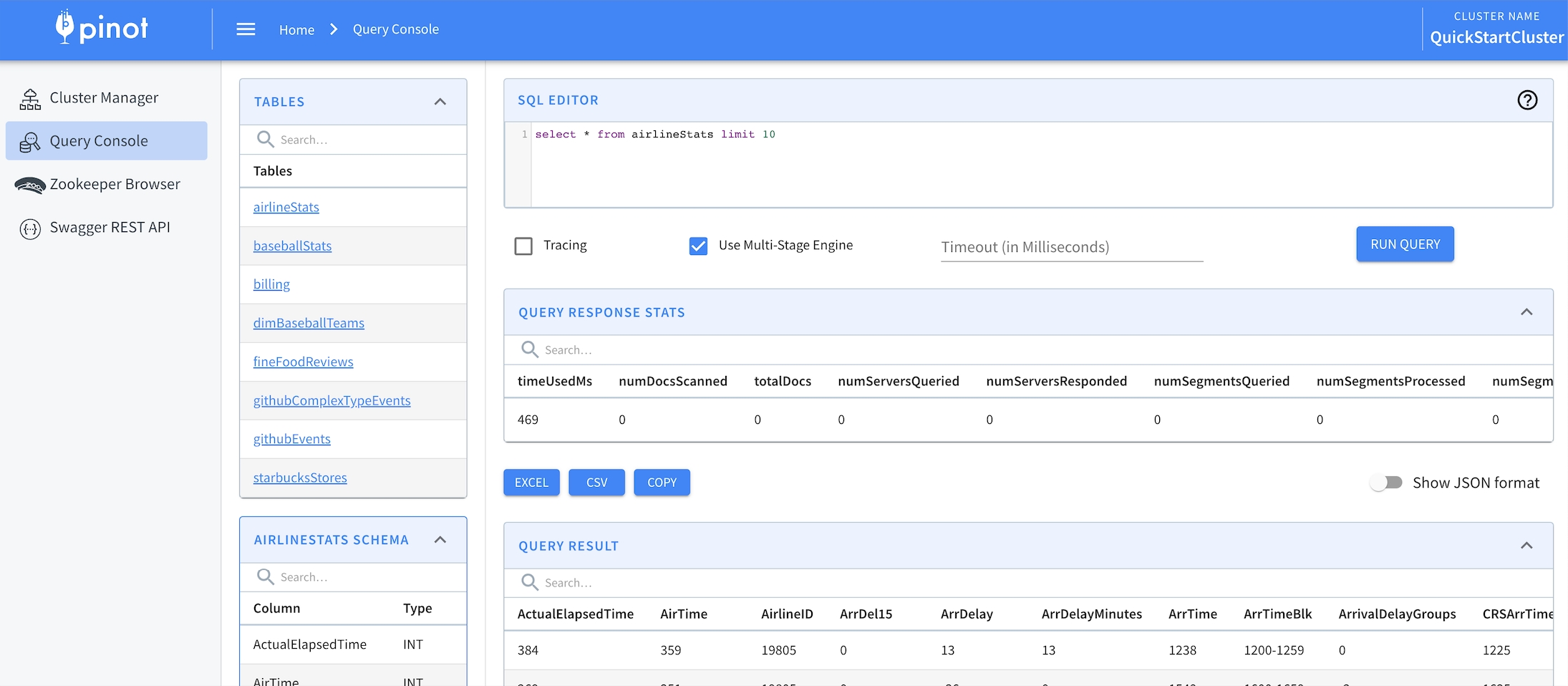 To enable the multi-stage query engine, in the Pinot Query Console, select the Use Multi-Stage Engine check box.