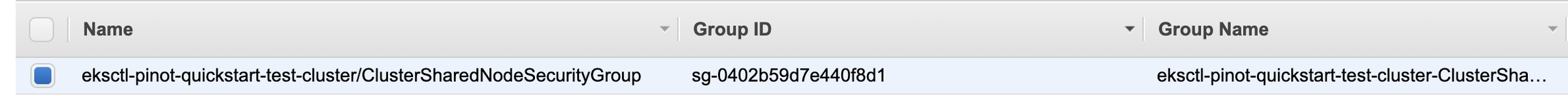 SecurityGroupson left bar. Find the EKS Security group:eksctl-${PINOT_EKS_CLUSTER}-cluster/ClusterSharedNodeSecurityGroup.