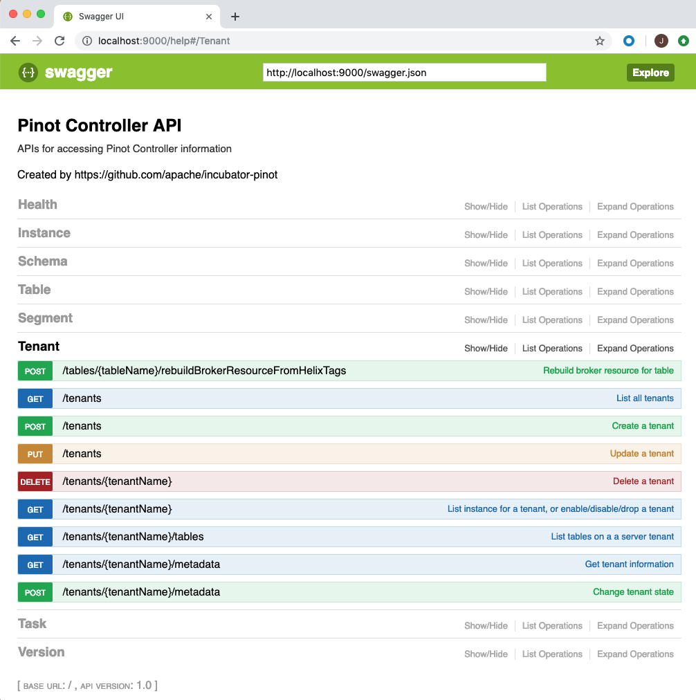 The web based management console allows operations on tables, tenants, segments and schemas. You can access the console via http://controller-host:port/help. The console also allows you to enter queries for interactive debugging. Here are some screen-shots from the console.