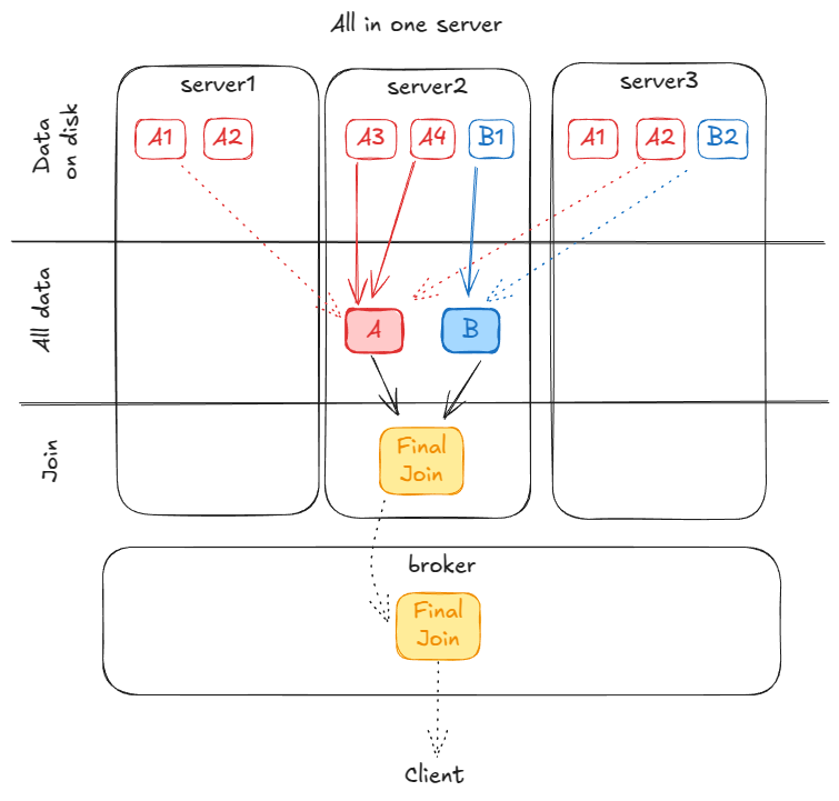 This approach may work for small tables, but it would not scale for large tables that do not fit into a single server. Pinot assumes this is going to be the common case, so it never uses this technique. It is shown here only to help understand the shuffling problem.