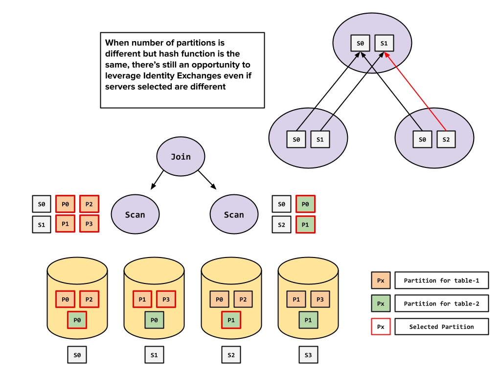 If the hash-function used for partitioning the two tables is the same, we can leverage an Identity Exchange and skip re-partitioning the data on either side of the join. This is because S0 will consist of records from partitions and of the Orange table, which together contain all records that would make up partition modulo 2. i.e.