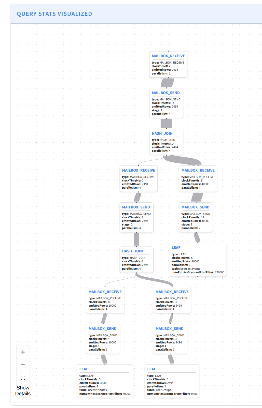 Here we can see there are 5 stages (one for each MAILBOX_SEND operator). A significant part of the time is spent in HASH_JOIN on stage 1, followed by the read on userFactEvents. We can also see that stage 5, the one that reads from userFactEvents , returns 40000 rows while the other stage returns 2494 rows, so as explained in Optimizing joins, it is better to have the smaller table on the right side of the join, so the query would be faster if written as: