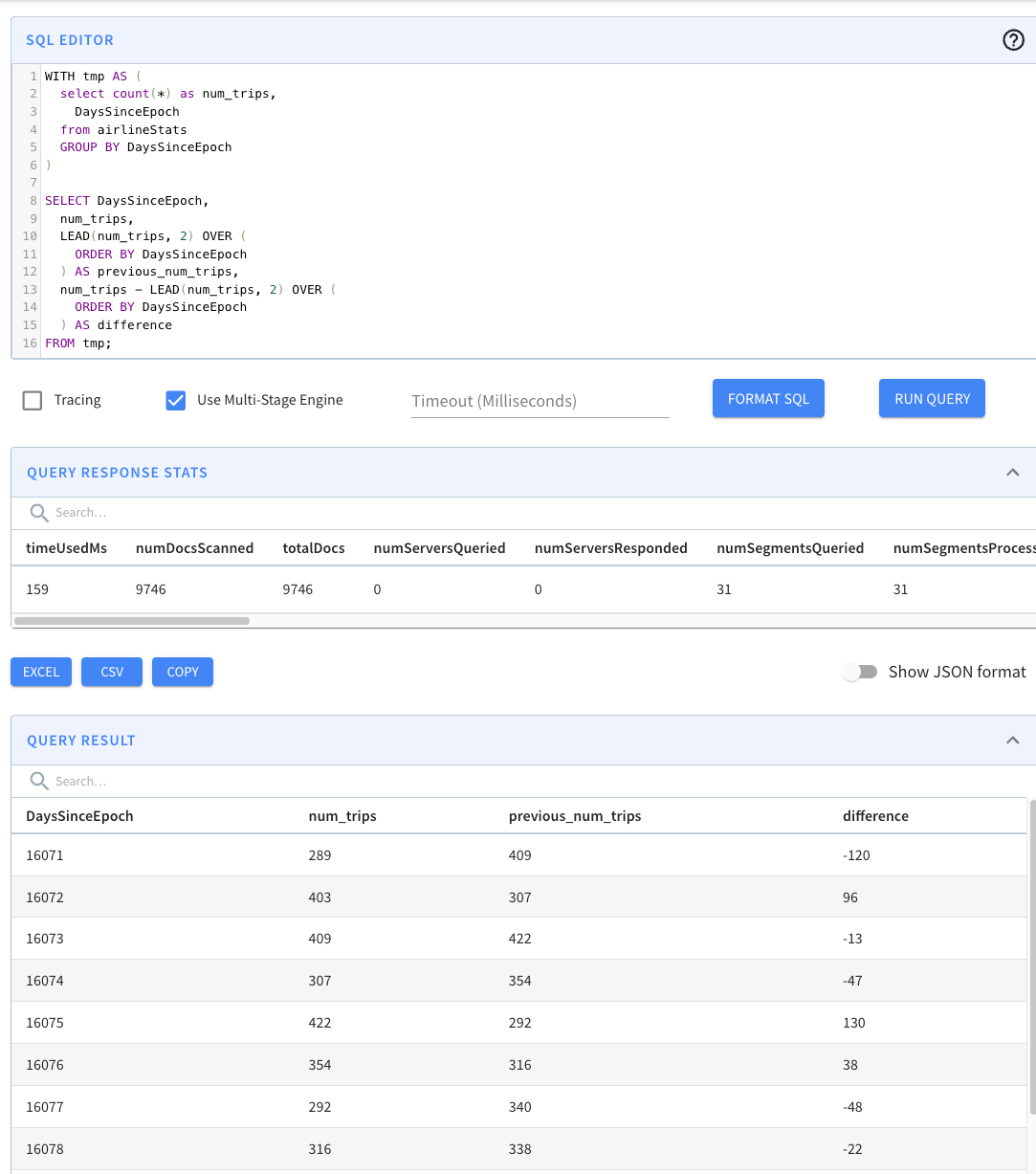 Returns the value from a following row in the same result set, based on a specified physical offset. It can be used to compare values in the current row with values in a subsequent row.