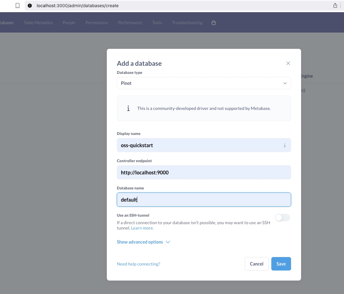 This guide provides step-by-step instructions for setting up Metabase with an Apache Pinot connector. The integration allows you to visualize and explore data stored in Apache Pinot directly within Metabase dashboards.