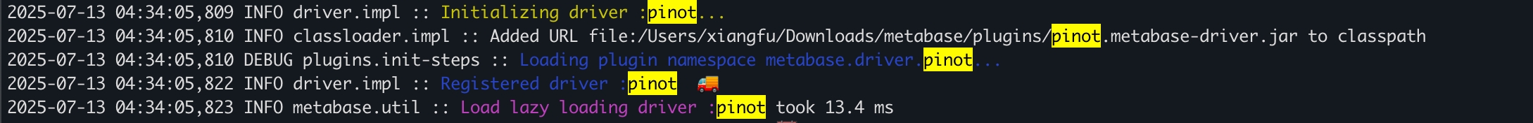 java --add-opens java.base/java.nio=ALL-UNNAMED -jar metabase.jarNow everything should come up, you could also find the pinot plugin is loaed from the log: