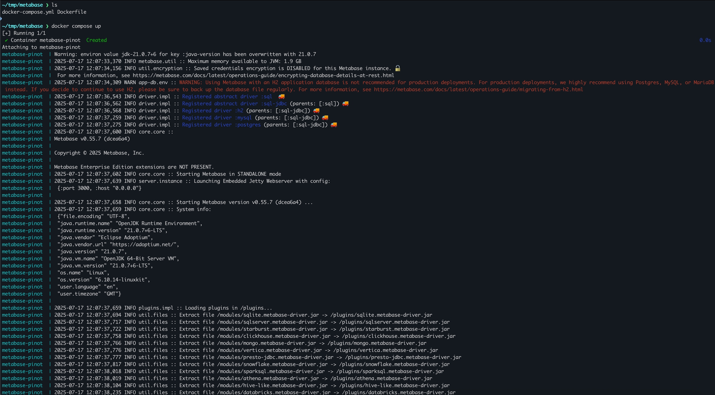 docker run -d --name pinot-quickstart -p 9000:9000 -p 8000:8000 -p 8080:8080 apachepinot/pinot:latest QuickStart -type MULTI_STAGEDownload Metabase