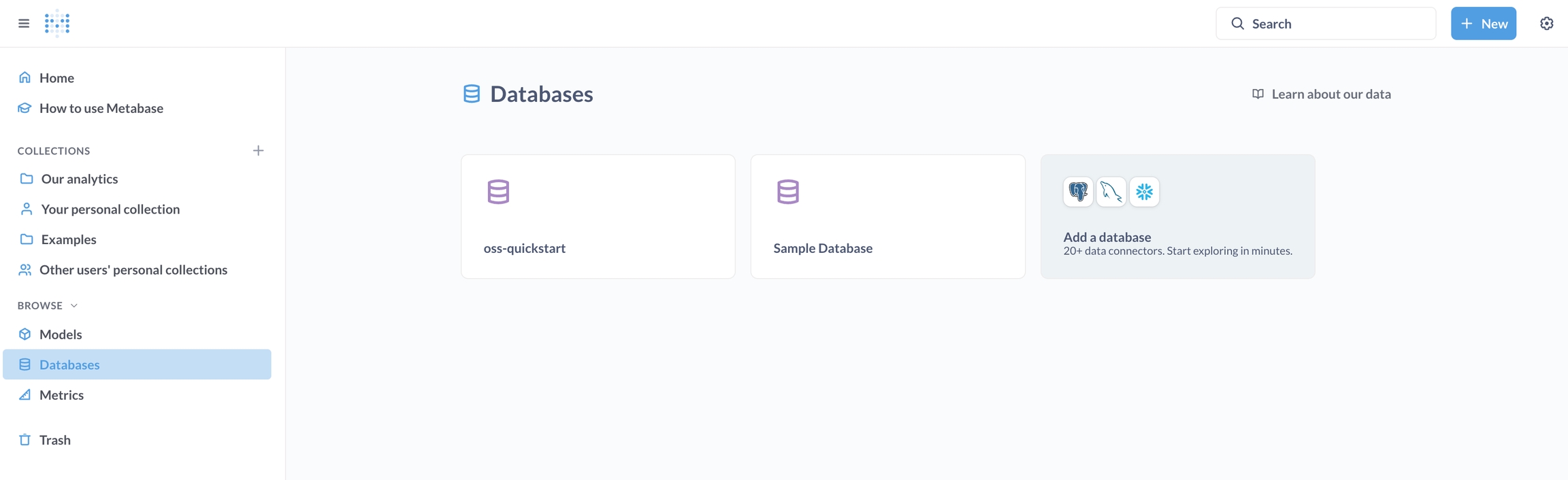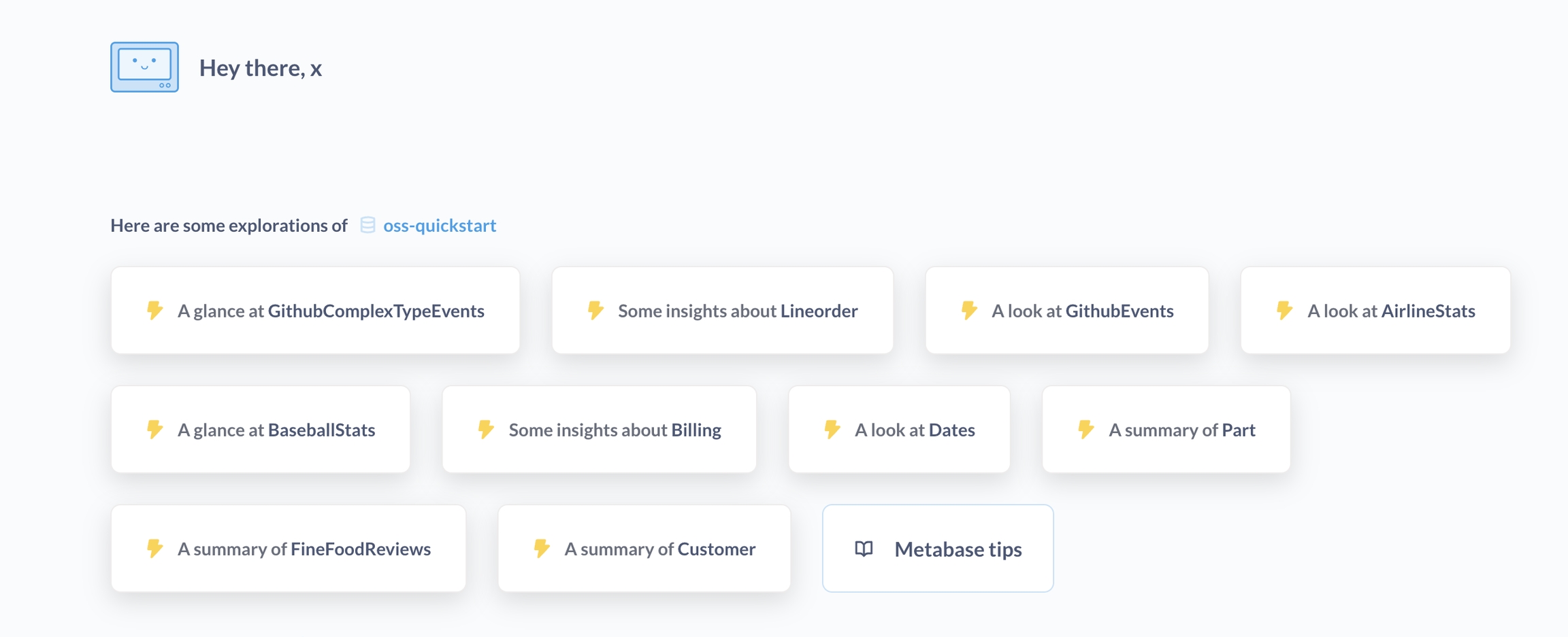 Once Metabase is up, go to http://localhost:3000 to explore it.