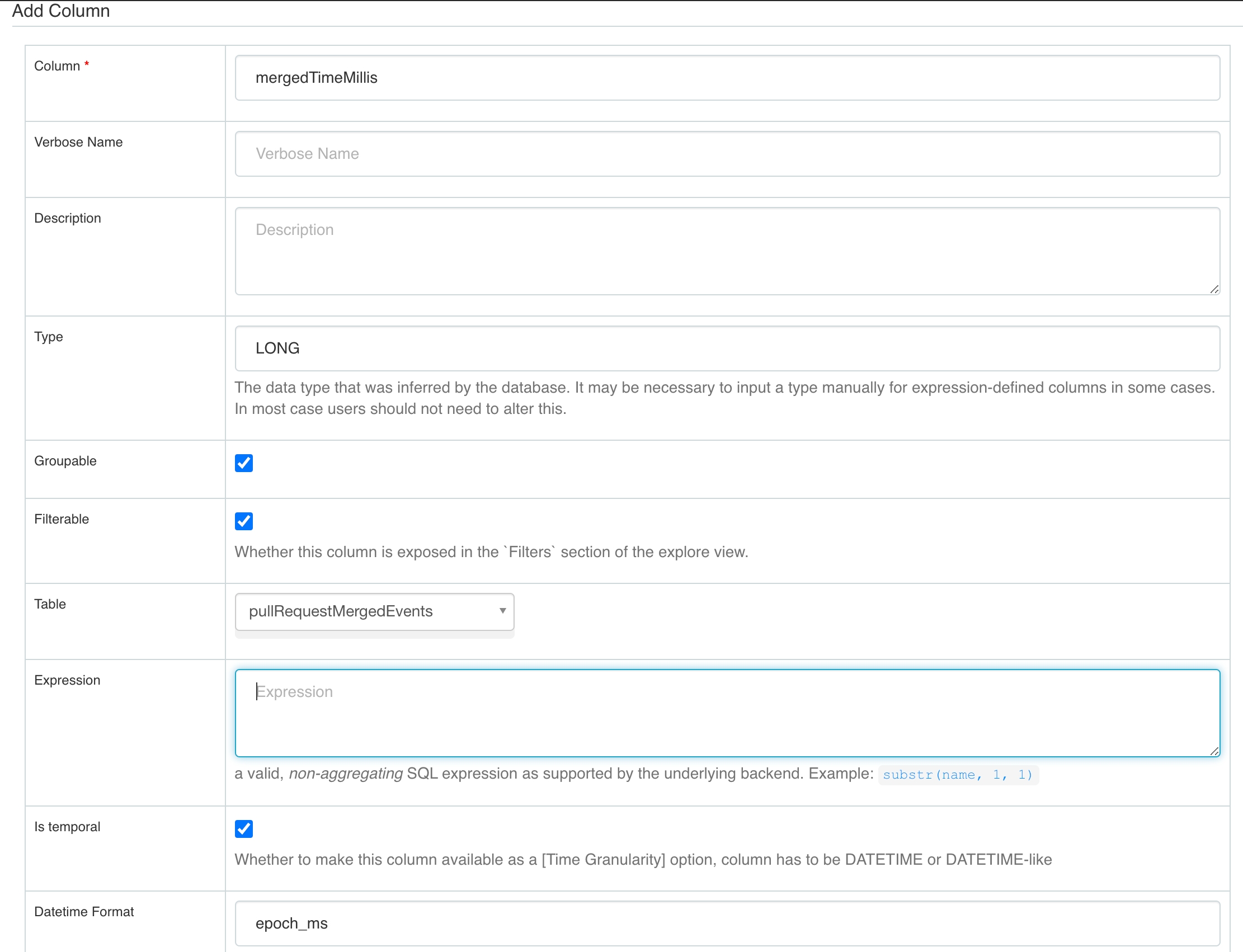 User can configure an existing column mergedTimeMillis as temporal and set Datetime Format accordingly.