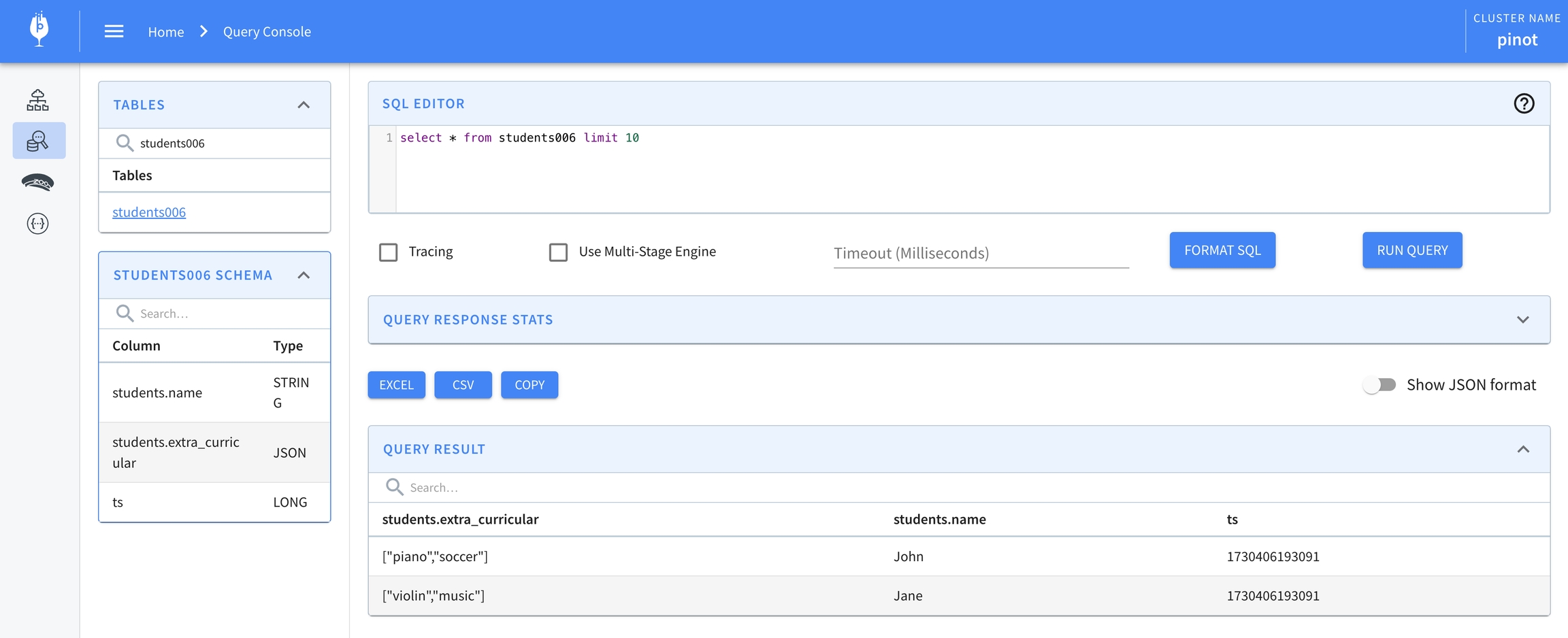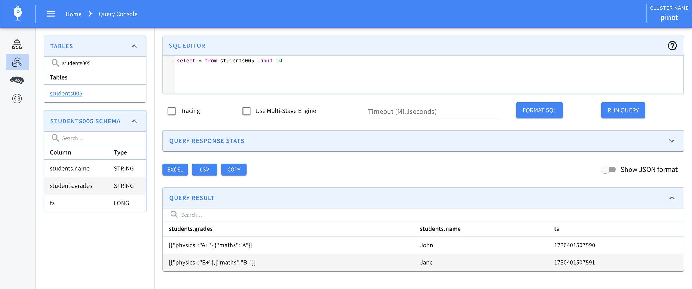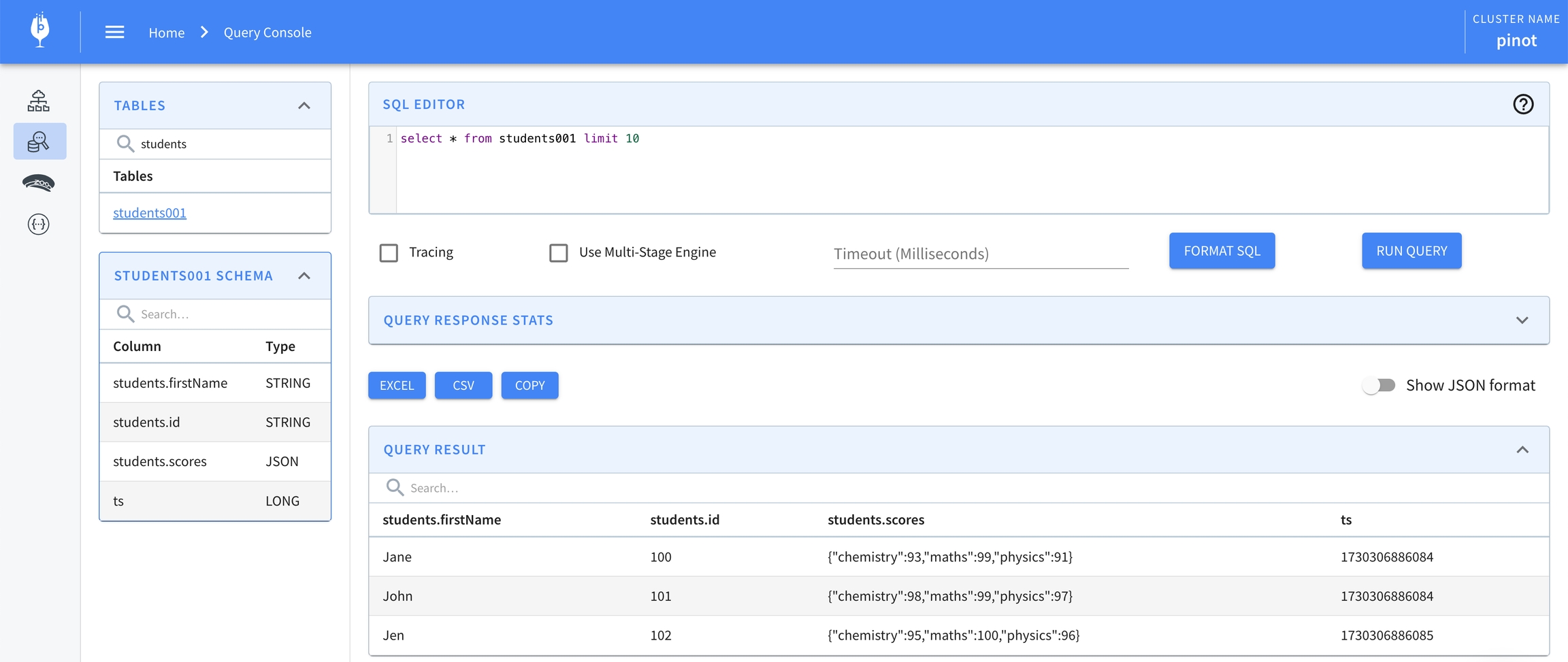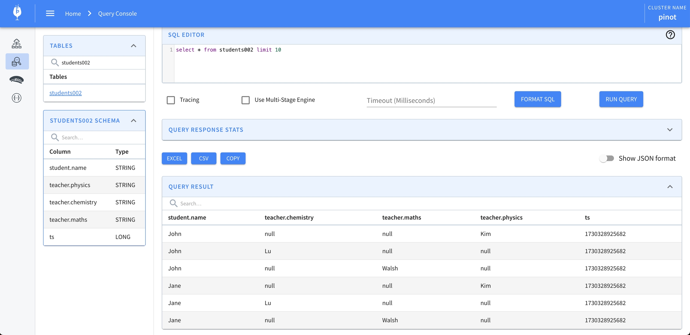 Post ingestion, the student records would appear as separate records in Pinot. Note that the nested field scores is captured as a JSON field.