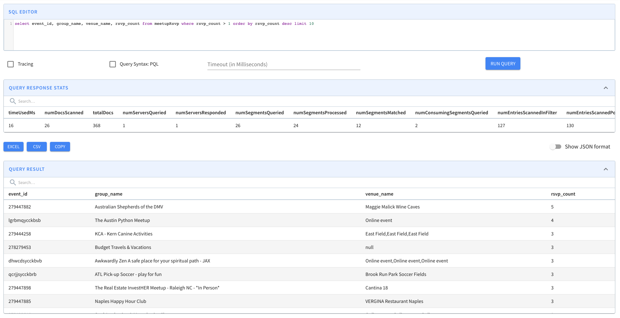 As soon as data flows into the stream, the Pinot table will consume it and it will be ready for querying. Head over to the Query Console to check out the real-time data.