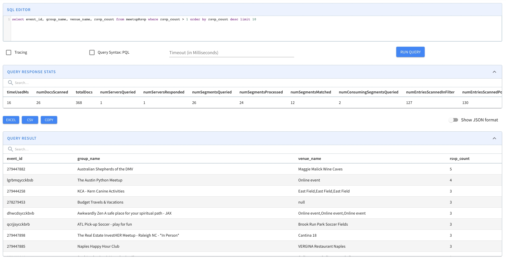 bin/quick-start-partial-upsert-streaming.shAs soon as data flows into the stream, the Pinot table will consume it and it will be ready for querying. Head over to the Query Console to check out the real-time data.