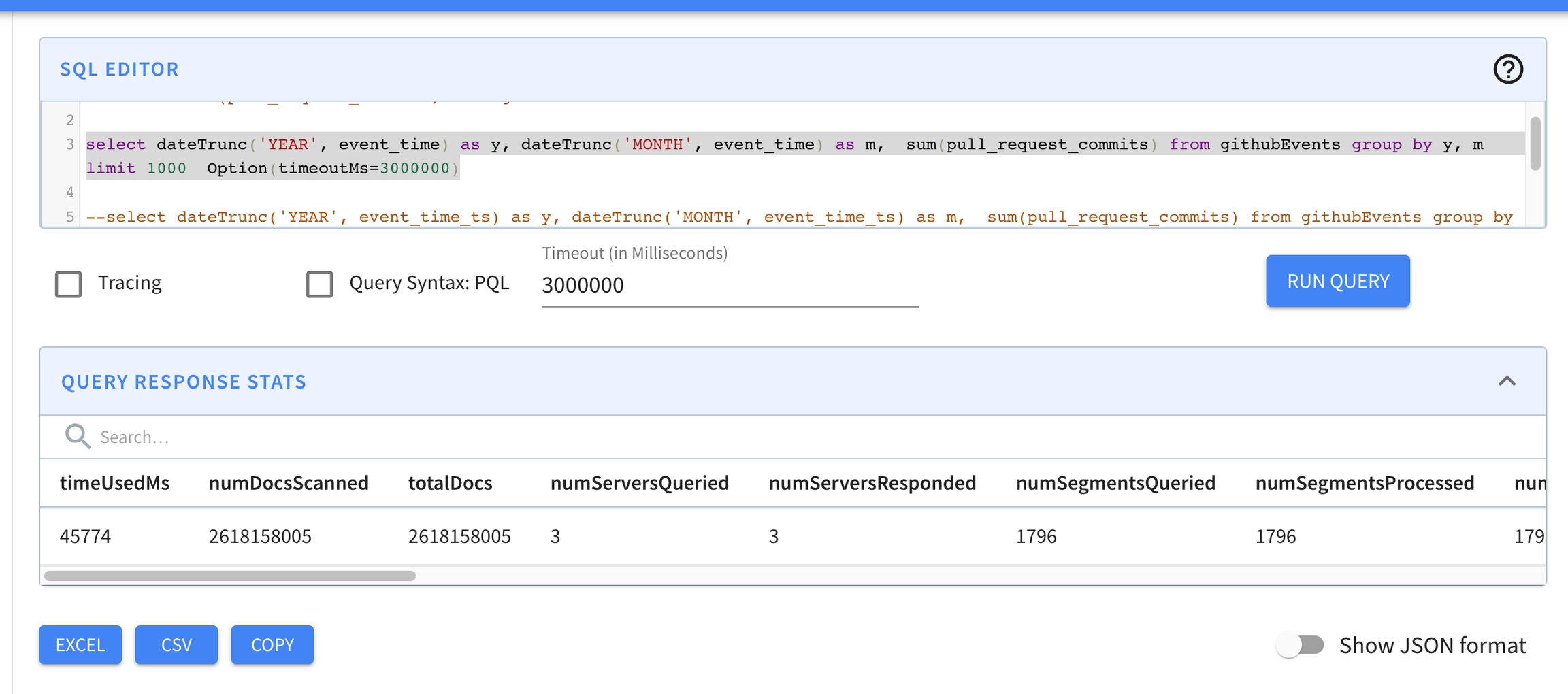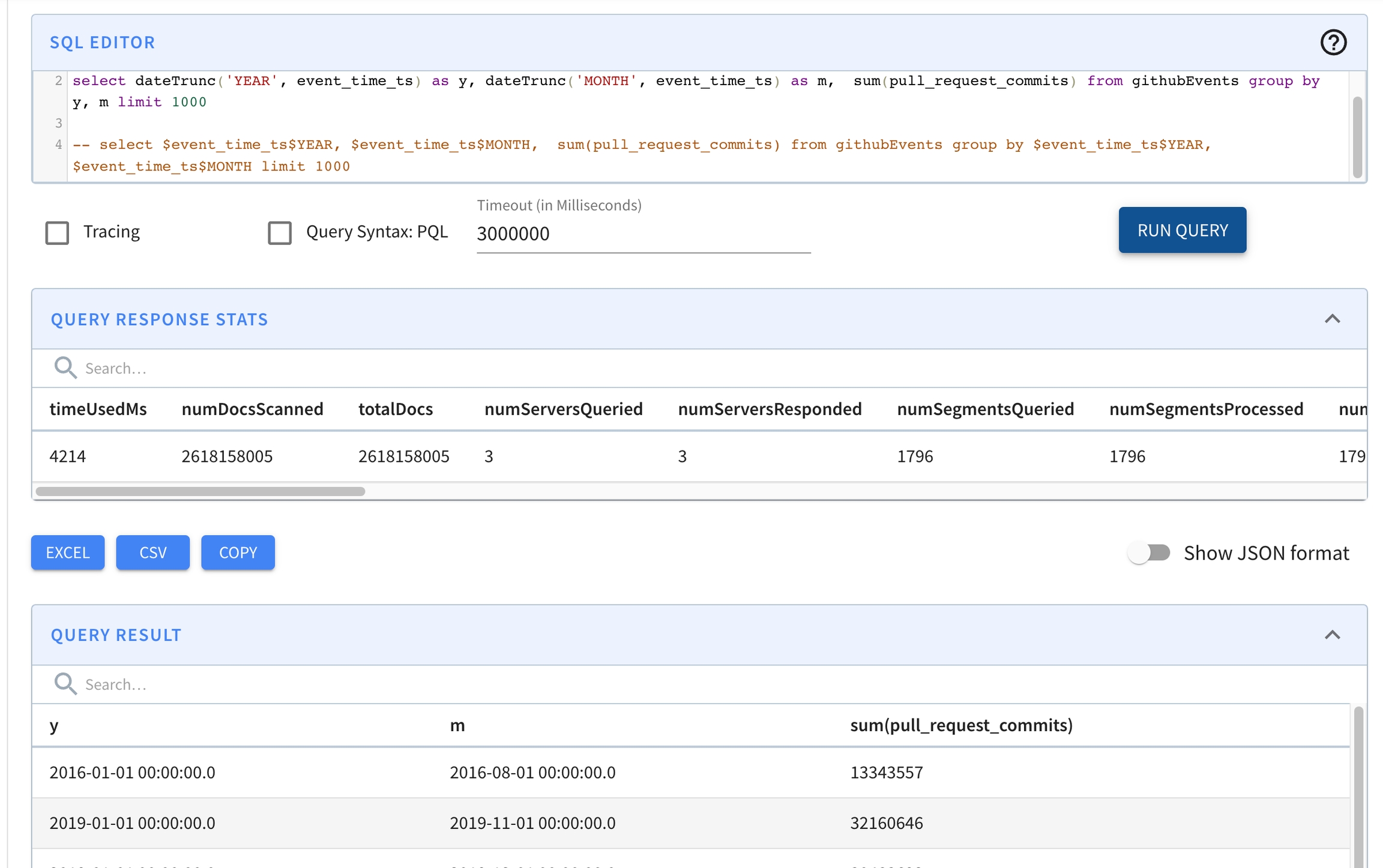 $${ts_column_name}$${ts_granularity}, where the timestamp columntswith granularitiesDAY,MONTHwill have two extra columns generated:$ts$DAYand$ts$MONTH.Query overwrite for predicate and selection/group by: 2.1 GROUP BY: Functions like